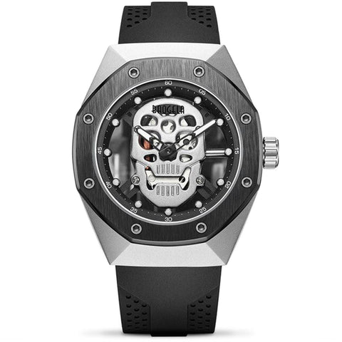 Låt oss presentera klockan Skullmaster med sin kraftfulla design från Baogela. En borstad silverfärgad boett som erbjuder en formgivning som du garanterat inte hittar varsomhelst. Klockan sitter bekvämt runt handleden tack vare ett justerbart armband i gummi som är lika behagligt som det är starkt.
